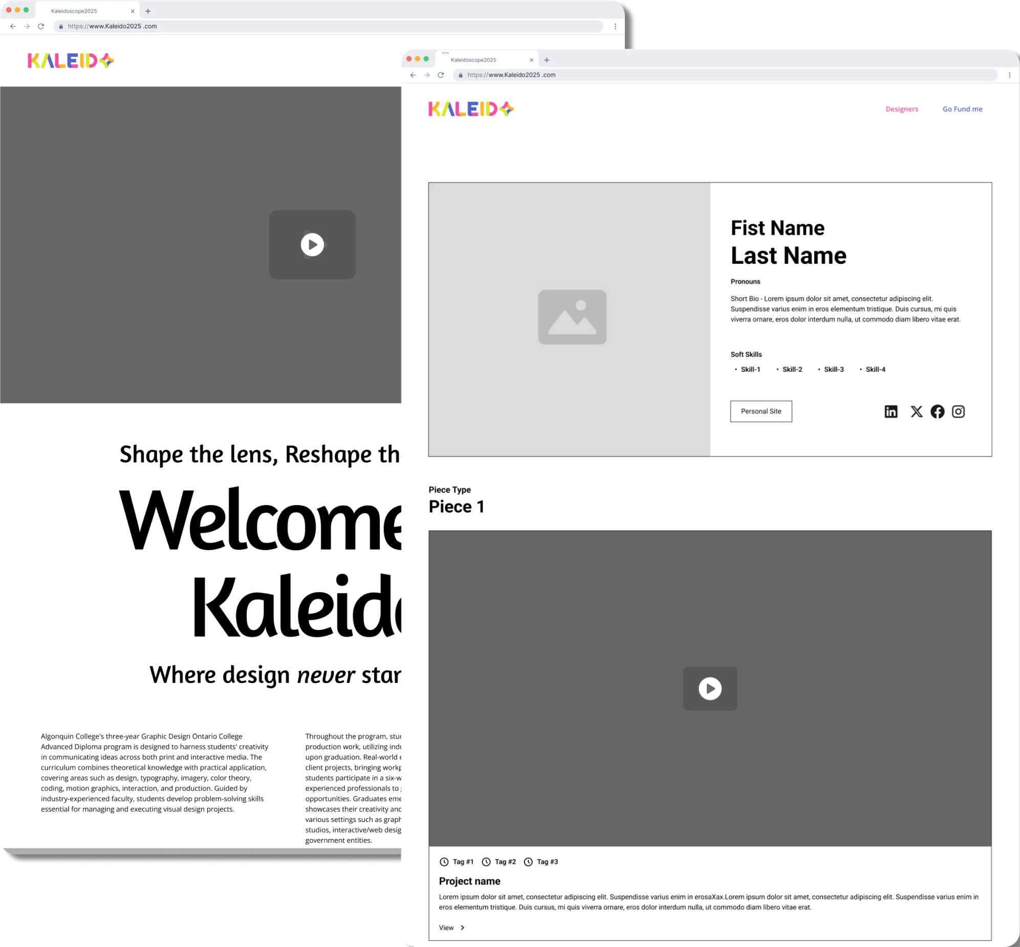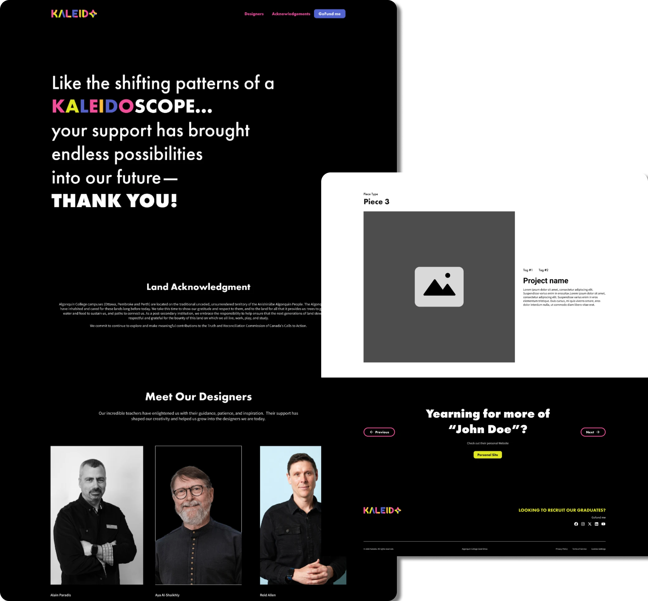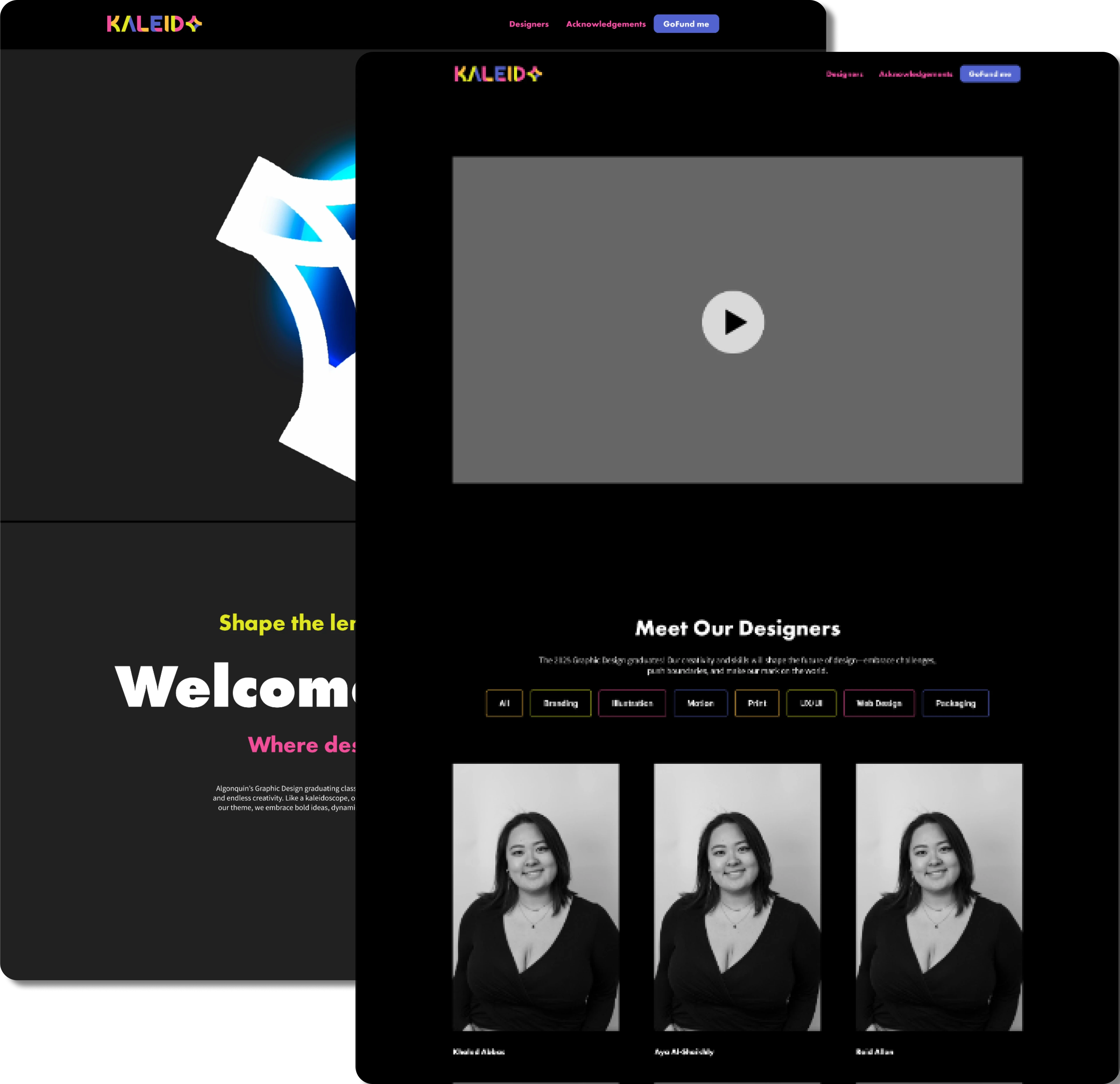 I was appointed as Team Lead to design and build out a website for my school program's graduation show. The website's main use was to have all information on the graduation show's details and showcased each individual designer that graduated from the Graphic Design program. As a class, we decided on the theme of kaleidoscopes, symbolizing our uniqueness and ability "shift the lens" to reshape the future. The project was a big task of not only learning complex webflow skills, but also taught me a whole lot about managing people.